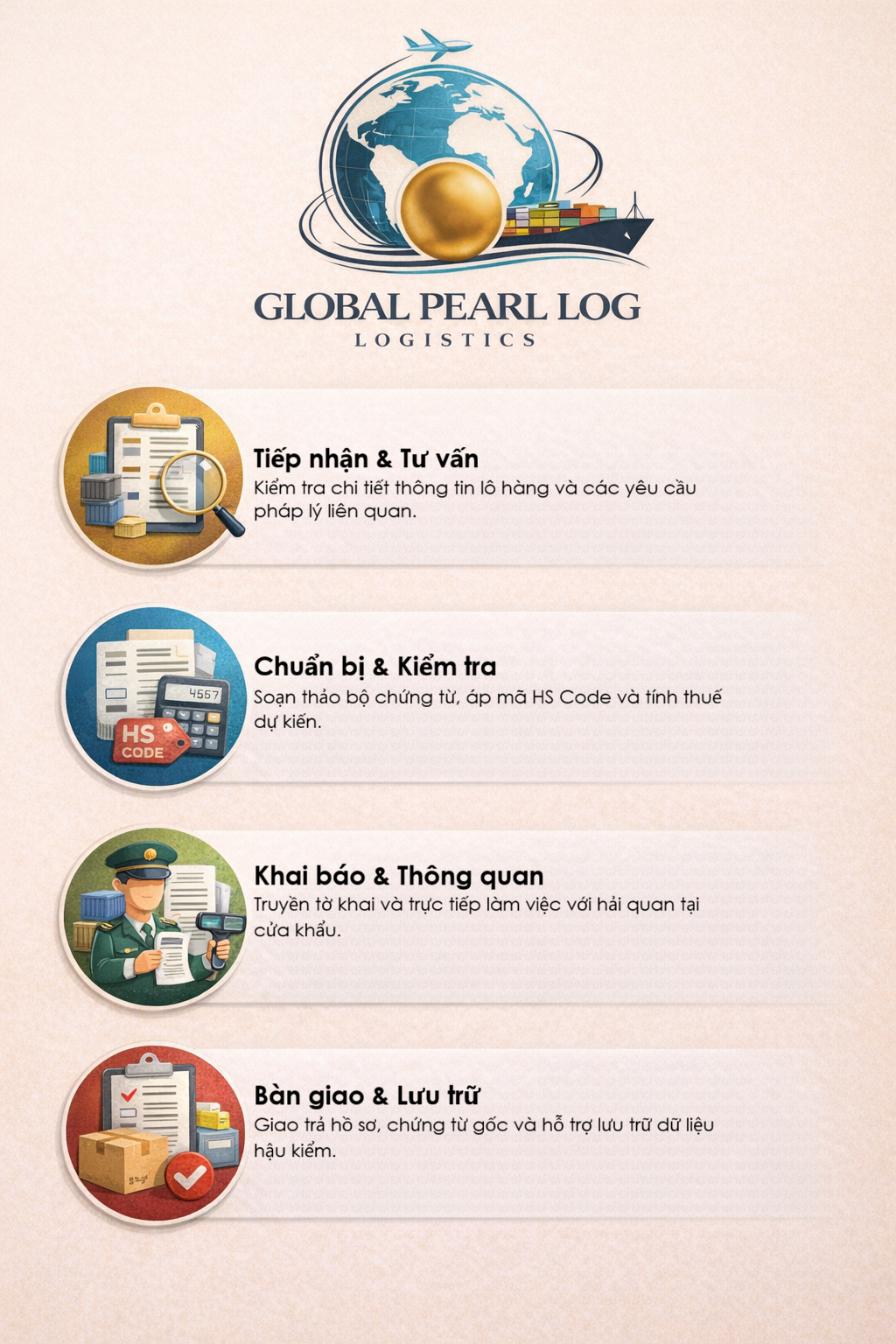 Global Pearl Logistics cung cấp dịch vụ khai báo hải quan và xử lý chứng từ xuất nhập khẩu trọn gói, giúp doanh nghiệp thông quan nhanh – giảm rủi ro – tiết kiệm thời gian và chi phí.