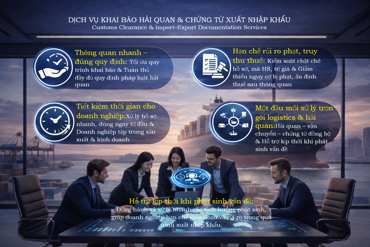 Chúng tôi hỗ trợ khách hàng từ khâu tư vấn hồ sơ, chuẩn bị chứng từ, khai báo điện tử đến xử lý phát sinh, đảm bảo hàng hóa được thông quan đúng quy định – đúng tiến độ.